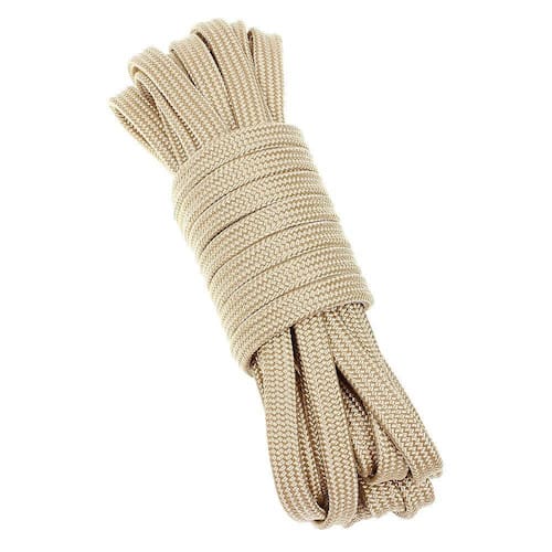 Corda trançada chata fabricada em 100% Polipropileno na cor Champanhe, bitola de 15mm com alta flexibilidade e resistência. Pode ser utilizada de várias maneiras como em cabos de cabresto, rédeas etc.