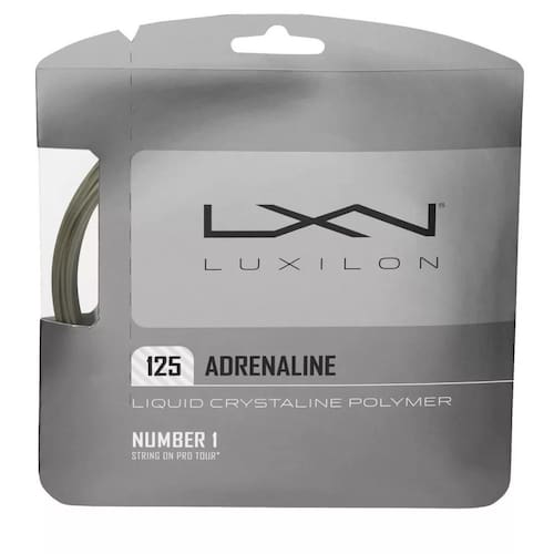 A Corda Luxilon Adrenaline 1.25 oferece ótima potência, precisão e controle para jogadores com estilo de jogo agressivo devido a nova tecnologia polímero cristalino liquido . Os jogadores encontrarão a confiança necessária para manter alta velocidade com amplo swing com esta corda, pois mantém o controle de resposta amigável a um spin mantendo seus tiros dentro das linhas da quadra. Uma excelente corda com uma qualidade espetacular. A Luxilon mantém sua tradição nas cordas "poli", dominando esta área, sendo a preferida pela maioria dos profissionais e também a referência para esta categoria de cordas. DESCRIÇÃO TÉCNICA: A nova corda Adrenaline da Luxilon utiliza a tecnologia "Liquid Crystaline Polymer" LCP que é uma combinação única de matérias-primas e processamento. A corda Adrenaline fornece um bom spin com grande durabilidade e manutenção de tensão. Com sua construção monofilamento de poliéster, a Luxilon recomenda encordoar as raquetes com uma redução de 10% em comparação com uma corda de nylon típico. CARACTERÍSTICAS GERAIS: - Perfil: Potência e spin, - Material: Co-polímero, - Detalhamento: Um set de corda na cor cinza com 12,2m, - Espessura: 16L/ 1.25 mm, - Marca/Fabricante: Luxilon - Modelo: Adrenaline 1.25 - Set individual para 1 encordoamento - Espessura: 1,25mm - Composição: Co-polímero - Cor: prata - Corda oficial da Sony Ericsson WTA Tour - Orígem: - Fabricação: Bélgica CARACTERÍSTICAS TÉCNICAS: - Composição: Liquid Crystaline Polymer - Construção: monofilamento - Gauge: 16L/1.25mm - Peso adicional aproximado a raquete: 14g