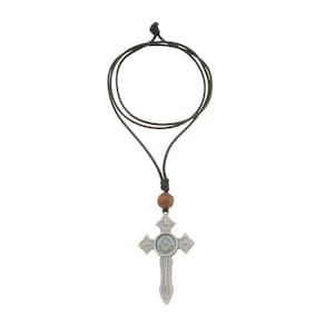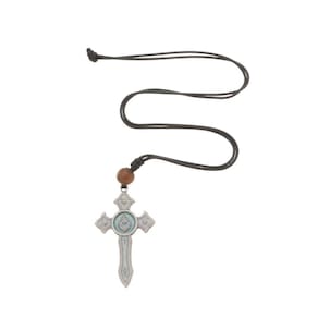 Este lindo cordão Crucifixo da espada de São Miguel Arcanjo! Com barbante em couro sintético marrom escuro, o acessório apresenta uma Cruz no formato da espada de São Bento, no meio dele há um coração com uma pequena Cruz e uma chama em cima (tudo inteiramente de metal em prata velha). Há também uma conta em madeira. São Miguel é conhecido como Guardião Celeste, Príncipe da Milícia Celeste e Guerreiro Defensor do Povo de Deus. Ele defende também a Santa Igreja Católica, sendo o Arcanjo da Justiça e do Arrependimento.