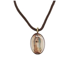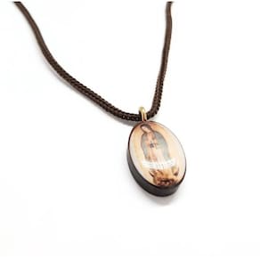 - Feita com madeira natural de reflorestamento - Cordão marrom para pendurar no pescoço - Medalha oval de 2,5 cm com imagem resinada de Nossa Senhora de Guadalupe - Produto de indústria brasileira