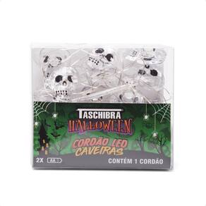 Cordão Luminoso Taschibra Halloween Caveiras a Pilha Características Gerais do Produto: Benefícios do produto: Longa durabilidade, LED de alto brilho, uso em decorações e centro de mesa Dimensões AxLxP CM : 90cm Formato: Figuras Cor da luz: 3000K Quente Produzido em: Plástico de Engenharia, Alumínio, Placa de Circuito Impresso e Componentes Eletrônicos Voltagem: 2 Duas Pilhas AA Cor acabamento: Transparente Claro Potência: 0,6W Eficiência luminosa: Decorativo Cor do cabo: Transparente IRC: 80 Ângulo de abertura: 360 : 90 dias junto ao fabricante Aplicação: Interno ou Abrigado Vida útil: 25.000 horas Acompanha lâmpada: Não necessita, LED já integrado Grau de proteção: IP20 Acompanha o produto: 01 Cordão Luminoso : 90 dias Marca: Não Informado