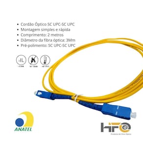 Cordão óptico sc upc com conectores homologado p/switches roteadores Seja bem-vindo a à hfo Produto - cordão óptico sc upc-sc upc Se busca uma solução eficaz para interligar equipamentos de transmissão ou conectá-los a distribuidores internos ópticos com baixa perda de inserção, o cordão óptico sc upc-sc upc é a resposta conectores sc-upc em ambas as pontas asseguram uma performance confiável. Além disso, nossa inclui um cordão de 2 metros por 3 milímetros, atendendo suas necessidades de conectividade com eficiência. Características do produto: Conector sc-upc em ambas as pontas Baixa perda de inserção Cabo monomodo de alta performance Capa externa retardante à chama Especificações técnicas do produto: Tipo de fibra: monomodo - simplex Modelo: sc-upc / sc-upc Número de fibras: 1 Temperatura de armazenagem: -40ºc70ºc Temperatura de operação: -20 a +65 Cor da capa externa: amarela Il 1 : 0.25db - il 2 : 0.15db Rl 1 : 56db - rl 2 : 55db Capa externa pvc: retardante à chama Aplicações: interligar os equipamentos de transmissão ou para interligá-los a distribuidores Internos ópticos, com baixa perda de inserção. Dimensões e peso do produto: Dimensões: comprimento 2 metros, espessura 3 milímetros Peso: 0.012g Conteúdo da embalagem: 01 cordão óptico 2m x 3mm sc-upc sc-upc Recomendações: Ao instalar ou desconectar o cordão, evite aplicar força excessiva. Manuseie-o com cuidado para evitar danos ao polimento. Instale o cordão em ambientes limpos e livres de poeira. A presença de partículas ou sujeira pode afetar a qualidade da conexão e a eficiência do dispositivo. Quando não estiver em uso, armazene o cordão em um local seco e protegido, longe de fontes de calor ou umidade excessiva. Experimente agora e impulsione sua rede para um desempenho superior Agradecemos sua visita e aguardamos sua compra. Marca: Hfo Ean: 7893567498693