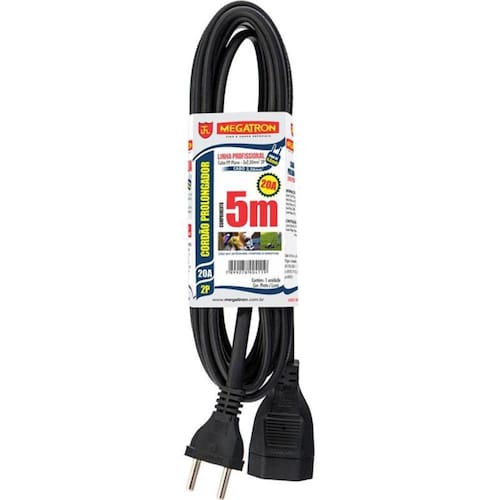 CORDAO PROLONGADOR PP 2X2,50X5,00MT 2P 20A/250V PT MEGATRONApresentamos os cordões prolongadores 20A, produtos de qualidade e que garantem segurança aos usuários, atendendo ao novo padrão brasileiro de plugues e tomadas (NBR 14136).Modelo: Cordão Prolongador 20AAmperagem: 20A / 250VEspessura do cabo: 2,50mm²Número de tomadas: 01*Ideal para: Para prolongar a tomada dos equipamentos para distancias longas, de até 5,00 mt. É utilizado geralmente em trabalhos com betoneiras, cortadores de gramas, ferramentas, entre outros.**Imagens meramente ilustrativa.*Marca: MegatronCódigo:79874