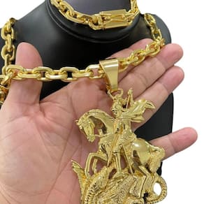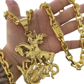 Cordão + Pulseira 12mm + Pingente São Jorge - Banhado a ouro Detalhes do Produto: Material: ligas metálicas de alta qualidade, especialmente tratadas para fixação e absorção do ouro, com acabamento em verniz protetor. Aparência: visual idêntico ao ouro maciço. Produção: artesanal, com atenção meticulosa aos detalhes. Banho: 10 camadas espessas de ouro 18k, finalizadas com verniz antialérgico . Elos: soldados varia conforme o modelo . Pedras: zircônias brilhantes cravejadas quando aplicável . Tamanhos Disponíveis: Cordões Masculinos: 70cm padrão e 60cm sob consulta/Pedido Via Chat . Cordões Femininos: 50cm padrão e 45cm sob consulta/Pedido Via Chat . Pulseiras: 21cm padrão ; tamanhos de 18cm a 23cm sob consulta/Pedido Via Chat. Pingentes: conforme imagens; consulte para mais detalhes via chat. Espessuras Recomendadas para Cordões / Pingentes: P: 1mm a 4mm M: 4mm a 8mm G: 6mm a 13mm Gg: 12mm a 18mm Incluso na Compra: Saquinho de organza para armazenamento seguro. Caixa elegante, perfeita para presente. Cupom de desconto para a próxima compra. Flyer com outros produtos da coleção. Carta de agradecimento personalizada. Adesivo da marca ToJoia18k. Informações Adicionais: : 6 meses termos acompanham o produto . Devolução: 7 dias para devolução sem questionamentos. Envio: despacho em até 24 horas úteis após confirmação do pagamento. Cuidados com a Peça: Evite contato com produtos químicos; aguarde o perfume secar antes de usar. Evite contato com shampoo, condicionadores e suor excessivo. Armazene em local seco, preferencialmente no saquinho de organza fornecido. Uso no mar e piscina é permitido; lave com água corrente e sabão neutro após. Por que Escolher a ToJoia18k Semi-joias luxuosas que combinam estilo, qualidade e sofisticação. Banho espesso de ouro 18k, garantindo brilho duradouro e acabamento impecável. Design exclusivo e produção artesanal, perfeitos para qualquer ocasião. Materiais premium que asseguram durabilidade. Ao escolher uma semi-joia ToJoia18k, você investe em qualidade, elegância e uma experiência única. Aguardamos sua compra Observação: pode ocorrer variação no fecho raramente . Imagens reais, sem edição. Qualquer dúvida, estamos à disposição para esclarecimentos. Marca: Tojoia18K
