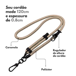 O Cordão Universal da NERDCASE é o acessório ideal pra quem busca praticidade e mobilidade no dia a dia. Produzido em poliéster trançado resistente na cor caramelo, ele acompanha adaptador universal e mosquetões metálicos que garantem segurança e estilo. Compatível com qualquer capa que tenha entrada para carregador, permite usar o celular no pescoço ou transversal, mantendo as mãos livres com conforto.