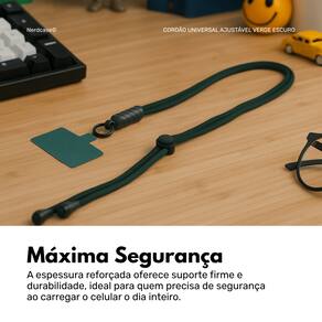 FoscoLeve seu celular com estilo e liberdade! O Cordão Universal da NERDCASE é feito em poliéster resistente, medindo 75cm de comprimento e 0,5mm de espessura, na cor verde escuro, com ajuste de tamanho para uso transversal, no pescoço ou costas. Ideal para qualquer modelo de celular com capa, ele acompanha base adesiva compatível. Um acessório funcional para quem quer manter o celular sempre à mão com conforto e segurança no dia a dia, viagens ou rolês.