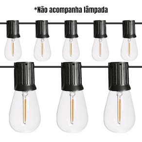 Cód: 80169Cordão Varal de Luzes Eco Preto 10E27 10M IP54Soquete: 10*E27 (Lâmpadas não inclusas)Comprimento: 10mDistância entre os soquetes: 100cmDimensões soquete: 4x3,5cm (AxL)Cor: PretoTensão: Bivolt*Uso Interno e Externo