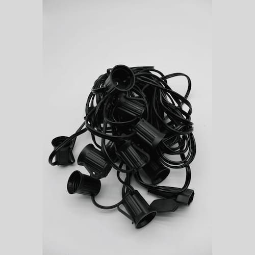 Cód: 80171 Cordão Varal de Luzes Eco Preto 15E27 15M IP54 Soquete: 15*E27 (Lâmpadas não inclusas) Comprimento: 15m Distância entre os soquetes: 100cm Dimensões soquete: 4x3,5cm (AxL) Cor: Preto Tensão: Bivolt *Uso Interno e Externo