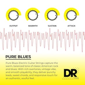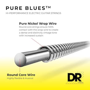 - Rico tom vintage – Desfrute de tons de guitarra mais ricos e gordos graças à construção de núcleo redondo. A DR Strings usa esta técnica antiga para dar às cordas Pure Blues seu tom harmonicamente quente e maior sustentação