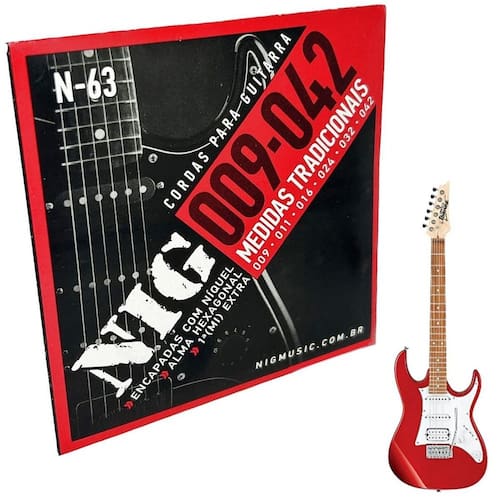 Cordas Guitarra Nig 09-42 + palheta + corda extra E mi Distribuidor Autorizado Está a procura de cordas de qualidade para a sua guitarra A linha de encordoamentos NIG vão te surpreender com o brilho no som, sustain e durabilidade. Proporcionam um timbre perfeito por músicos em todo o Brasil - Tensão .09 - Extra Leve - Encapadas com Nickel - Alma Hexagonal - Estanhadas e Polidas - contém 6 cordas + 1 corda E mi extra + 1 palheta Marca: Não Informado Ean: 7806127132814