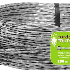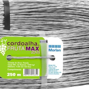 A Cordoalha Morlan Frutamax ZN3 é um cabo fabricado de arame de aço, com camada pesada de zinco e acabamento galvanizado. É rígida e indicada para uso na fruticultura ou em culturas aéreas, ideal para plantações suspensas, pois conta com proteção contra a corrosão causada pelos defensivos agrícolas. Possui resistência de 1000 kgf e diâmetro de 4,00 mm. Especificações: Uso: Culturas aéreas, fruticultura; Carga de ruptura: 1000 kgf; Diâmetro do fio: 4mm 3 fios ;