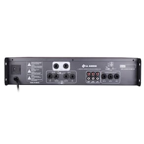 Entradas: 1 microfone mic1 com a função mic priority m.P. E c.V.I. 2 microfones mic2 e mic3 p10 c.V.I. 2 entradas auxiliares in com conectores p10 canais l/r 2 entradas auxiliares a1 e a2 com conectores rca estéreo s.A E c.V.I. 2 saídas send com conector p10 Saídas: 1 saída auxiliar line out com 2 conectores rca mono 1 saídas output com 2 conectores p10 e volume master 2 caixas de 8 ohms 140 w rms 1 caixa de 4 ohms 250 w rms