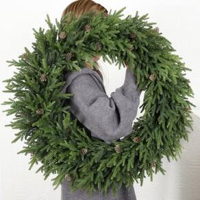 - Tamanho perfeito: nossa coroa de porta mede 28 polegadas de diâmetro, tornando-a a escolha ideal para a decoração de sua porta. Para evitar danos às coroas verdes durante o transporte, a coroa de flores é bem embalada na caixa. Basta ajustar as hastes da agulha de pinheiro para desdobrá-la e você obterá a exibição perfeita