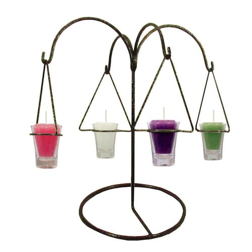 Esta coroa é composta por um pedestal com 4 pingentes em formato de velas, nas cores rosa, lilás, verde e branca. As velas são feitas de parafina 100%, garantindo uma queima limpa e duradoura, sem cheiro desagradável.
