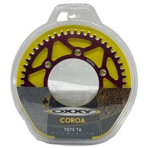 A Coroa Oxxy Alumínio 50 Dentes é fabricada em Alumínio 7075-T6 tratado termicamente, garantindo máxima leveza, resistência e durabilidade para uso em alto desempenho. Produzida por usinagem CNC de precisão, conta com design de sulcos para expulsão de lama nos dois lados, pintura anodizada e passe 520 para excelente encaixe e vida útil prolongada. Características Técnicas: