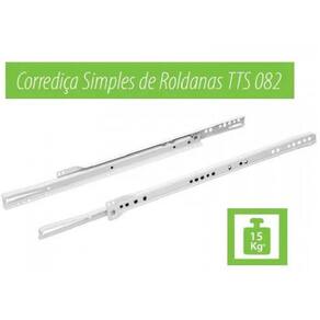Corrediça Simples de Roldanas TTS 082 Corrediça simples com abertura 3/4 do comprimento nominal e deslizamento suave com roldanas de poliacetal autolubrificadas. Duplo travamento aberto e sistema de fechamento automático Self-Closing e perfil Captive para compensar folgas laterais e estabilidade da gaveta. Material: Aço laminadoAcabamento: Pintura eletrostática epóxi branco, preto ou cinzaMedidas: 250, 300, 350, 400, 450 e 500 mmCapacidade: 15 kg por par Observações: Pode ser fornecida em bruto para soldar em gavetas metálicas. Recomendações de uso: Pode ser utilizada em gavetas de cozinhas, closets, quartos, banheiros, lavanderias, móveis em geral ou em prateleiras retráteis/extensíveis. Também tem seu uso previsto em bases para teclado. Benefícios: Fácil instalação Variedade de cores e medidas Excelente custo/benefício