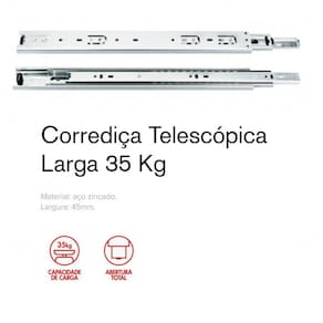 Corrediças telescópicas para gaveta de móveis e armários As corrediças telescópicas permitem abertura suave e total de gavetas, pastas suspensas e sistemas telescópicos, possui abertura total, Cada trilho é uma peça única que é fixada tanto na gaveta quanto na parede de apoio. Design moderno e discreto podendo ser usados em quartos, cozinha, banheiros, escritórios, salas de estar e jantar e áreas de serviço. Características e qualidades: produzido em aço zincado abertura suave, silenciosa e total das gavetas trava de final de curso fácil instalação grande resistência e durabilidade Ficha técnica: medidas: 40 x 4,5 x 1 cm comprimento, altura e largura capacidade máxima de peso: 35kg instalação com parafusos 3,5x14mm não inclusos Itens inclusos na embalagem: 1 Par es de trilhos telescópicos 40cm