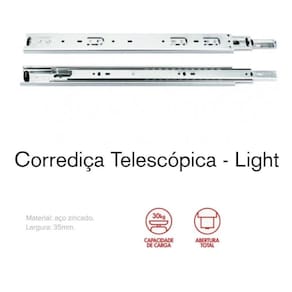Corrediças telescópicas Light para gaveta de móveis e armários As corrediças telescópicas permitem abertura suave e total de gavetas, pastas suspensas e sistemas telescópicos, possui abertura total, Cada trilho é uma peça única que é fixada tanto na gaveta quanto na parede de apoio. Design moderno e discreto podendo ser em quartos, cozinha, banheiros, escritórios, salas de estar e jantar e áreas de serviço. Características e qualidades: produzido em aço zincado abertura suave, silenciosa e total das gavetas trava de final de curso fácil instalação grande resistência e durabilidade Ficha técnica: medidas: 40x 3,5 x 1 cm comprimento, altura e largura capacidade máxima de peso: 30kg instalação com parafusos 3,5x14mm não inclusos Itens inclusos na embalagem: 1 Par es de trilhos telescópicos 40cm Marca: Não Informado Ean: 7899517433035