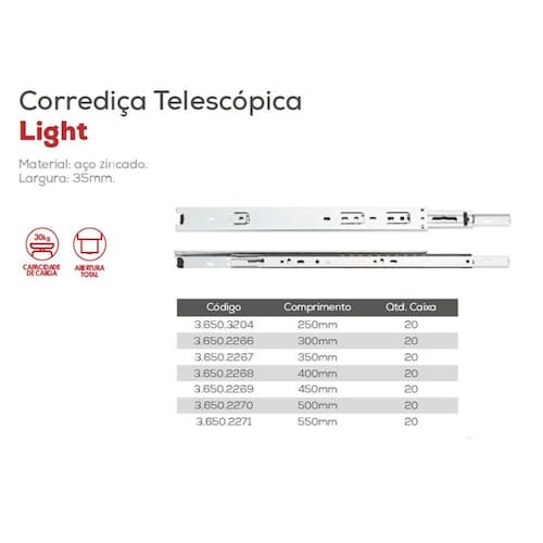 acabamento: zincado disponível nos tamanhos: 250 300 350 400 450 500 em outros anuncios espessura da chapa: 0,8x0,8x0,8 mm largura: 35 mm extração total capacidade de peso: 30 kg material: aço salt spray: 24 horas