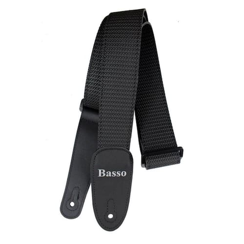 Correia em SINTÉTICO PRETO RECICLÁVEL – ESTAMPA ENTRELAÇADO - TRESSÊ. Possui 5 cm de largura, forro em sintético para não absorver o suor e ponteiras em sintético duplo para maior durabilidade e segurança no instrumento. Comprimento regulável entre e 110 e 150 cm.
