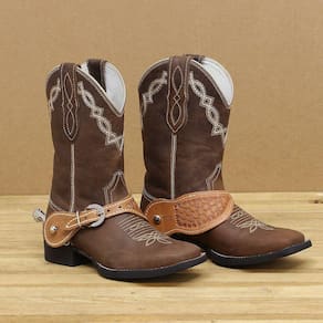 Correia de espora larga Bronc-Steel fabricada em couro na cor Natural com Óleo com costuras reforçadas, bordados (entalhados) e fivelas de aço inox para regulagem.