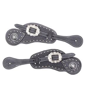 A Correia de Espora Larga com Margarida da Top Equine combina elegância e durabilidade. Feita de couro marrom de alta qualidade, possui uma fivela de metal em formato de flor, detalhes em relevo e tachas prateadas nas bordas. Este acessório é ideal para equitação, oferecendo um toque de sofisticação e originalidade.
