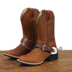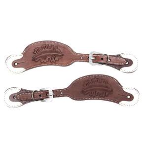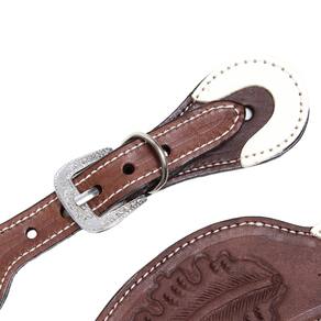 Correia de espora larga da marca Pyramid, esta fabricada em couro de alta qualidade na cor Marrom e ponteiras também em couro na cor Branca, possui costuras nas bordas, detalhes bordados e fivelas de metal totalmente trabalhada para regulagem.