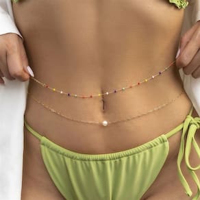 Estilo Elegante Com um estilo elegante e sofisticado, este cinto é perfeito para qualquer ocasião, seja casual ou formal. Também chamado de colar corporal, o Body Chain foi adaptado da cultura indiana e é uma peça perfeita para o verão. Pode ser utilizado na praia para complementar o biquíni, por cima da roupa ou também por baixo, mostrando o detalhe na barriga. Adequado para Mulheres Projetado especificamente para mulheres, este cinto adiciona um toque de feminilidade e charme ao seu look. Design Duplo Anel O design de duplo anel do cinto proporciona um ajuste confortável e seguro, mantendo-o em lugar durante todo o dia. Elementos de Moda Inclui elementos de moda como cristais coloridos e pérolas, tornando-o uma peça de destaque em qualquer conjunto. Material de Metal Este cinto é feito de metal de alta qualidade, garantindo durabilidade e resistência ao uso diário.