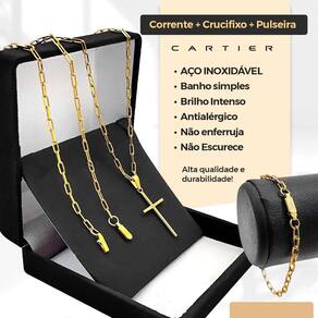 Kit de Acessórios Masculinos - Cordão, Pingente e Pulseira Banhados a Ouro 18KAdquira agora este elegante conjunto de acessórios masculinos e destaque-se em qualquer ocasião. As peças são banhadas a ouro 18K, adicionando um toque de classe ao seu estilo e simbolizando força e determinação. Este é o kit perfeito para homens que valorizam qualidade e elegância.INCLUI:1. Cordão Masculino Banhado a Ouro 18K - Estilo: Tijolinho - Comprimento: 70cm - Peso: 20gr - Espessura: 03mm2. Pingente Banhado a Ouro 18K - Formato: Cruz3. Pulseira Banhada a Ouro 18K - Estilo: Tijolinho, igual ao cordão - Comprimento: 20cm - Peso: 08gr - Espessura: 03mmBENEFÍCIOS:- Material antialérgico, seguro para todos os tipos de pele- Alta resistência à corrosão e oxidação, mantendo o brilho por mais tempo- Não escurece, não enferruja- Mais rígida e resistente que a prata- Não risca nem amassa facilmente- Alta durabilidade e fácil manutenção- Design elegante que complementa qualquer visualEste kit é a escolha perfeita para homens que desejam manter um visual sofisticado com acessórios de qualidade. Ideal para uso diário ou em ocasiões especiais. Não perca a oportunidade de exibir seu estilo e personalidade com peças que falam de poder e presença!IMPORTANTE: A caixa dos acessórios não está inclusa. As fotos da caixa são meramente ilustrativas.