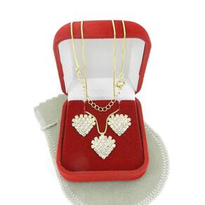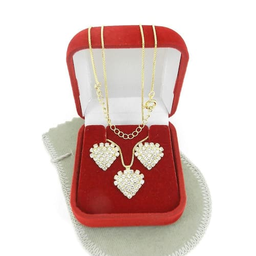 Corrente Feminina 45cm 1mm Coração + Brinco Folheado Ouro CJ101 Corrente Feminina 45cm 1mm Coração + Brinco Strás - 6Gr Beleza e Qualidade Sempre - Marca: Wnbijouterias - Modelo: Coração Strás - Tamanho Pingente/Brinco: 12mm - Modelo Fecho: Boia - Comprimento Corrente: 45cm - Modelo Corrente: Veneziana - Largura: 1mm - Peso Total: 6Gr - Acompanha Embalagem/Porta Joia - SKU Vendedor: CJ101 Descrição Técnica: - Produto com banho super resistente. - Processo de Folheação em 3 Camadas de Ouro 18k= 750 - Não descasca, não perde a cor, qualidade garantida - Grande tempo de durabilidade. - Acompanha Embalagem/Porta Jóia - Todas as Fotos são Reais do Produto Acompanha: Certificado de - apenas para descascamento do banho da jóia - não cobre defeitos de mau uso, aranhões ou quebra de partes da jóia Contra Indicações: - Não usar creme, shampoo, perfume, protetor solar e outros cosméticos por cima da jóia. - Evitar banho de mar Devido a oxidação da água Salgada - Evitar banho de piscina Devido a oxidação do Cloro e outros produtos O que você sempre ganha em nossa loja - Qualidade Banho Super Resistente - Antialérgico Não usamos Níquel em nosso banho - Beleza e Acabamento Caimento perfeito ao usar Ean: 7896181851516