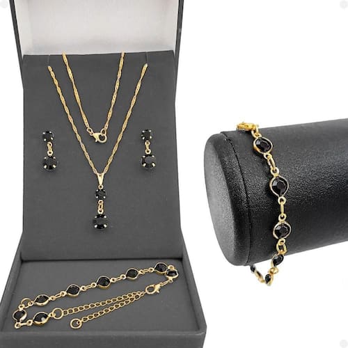 Os brincos e a pulseira apresentam pedrinhas de strass na cor preta, adicionando uma dose extra de elegância e brilho ao conjunto. Além disso, os acabamentos refinados tornam essas peças antialérgicas, resistentes à corrosão e oxidação, garantindo que não escureçam, enferrujem, arranhem ou amassem facilmente.
