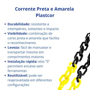 Durabilidade: resistente a intempéries, solventes e impacto Visibilidade: combinação de cores preta e amarela que facilita o reconhecimento Leveza: fácil de manusear e transportar mesmo em comprimentos maiores Instalação rápida: elos “S” permitem encaixe sem ferramentas Reutilizável: pode ser reaproveitada em diferentes configurações