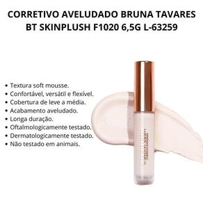 Corretivo Aveludado Bruna Tavares Bt Skinplush F1020 6,5G L-63259 Corretivo Aveludado Bt SkinPlush F1020Um corretivo de textura soft mousse que oferece uma cobertura de leve a média e acabamento aveludado. Além de corrigir, iluminar e camuflar, o BT Skinplush conta com diversos ativos que ajudam a atenuar a aparência das olheiras e bolsas ao redor dos olhos. Ele também auxilia na hidratação e melhora da elasticidade da pele. Possui uma textura mousse, versátil e aveludada que garante maior conforto ao longo do uso. Ele é resistente à água, suor e oleosidade.Subtom neutro pro frio..Benefícios-textura soft mousse.-confortável, versátil e flexível.-cobertura de leve a média.-acabamento aveludado.-longa duração.-oftalmologicamente testado.-dermatologicamente testado. -não testado em animais..Modo de UsoCom o auxílio do aplicador, deposite o corretivo nas áreas que deseja disfarçar e corrigir.Em seguida, dê leves batidinhas com a esponja, a ponta dos dedos ou com um pincel, até o produto aderir na pele de maneira natural e sem marcas.