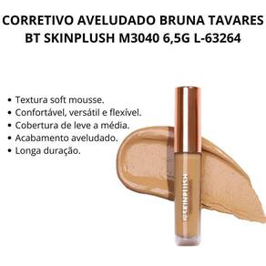 Corretivo Aveludado Bruna Tavares Bt Skinplush M3040 6,5G L-63264 Corretivo Aveludado Bt SkinPlush M3040 Um corretivo de textura soft mousse que oferece uma cobertura de leve a média e acabamento aveludado. Além de corrigir, iluminar e camuflar, o BT Skinplush conta com diversos ativos que ajudam a atenuar a aparência das olheiras e bolsas ao redor dos olhos. Ele também auxilia na hidratação e melhora da elasticidade da pele. Possui uma textura mousse, versátil e aveludada que garante maior conforto ao longo do uso. Ele é resistente à água, suor e oleosidade.Subtom oliva. . Benefícios -textura soft mousse. -confortável, versátil e flexível. -cobertura de leve a média. -acabamento aveludado. -longa duração. -oftalmologicamente testado. -dermatologicamente testado. -não testado em animais. . Modo de Uso Com o auxílio do aplicador, deposite o corretivo nas áreas que deseja disfarçar e corrigir.Em seguida, dê leves batidinhas com a esponja, a ponta dos dedos ou com um pincel, até o produto aderir na pele de maneira natural e sem marcas. Ean: 7896032679238