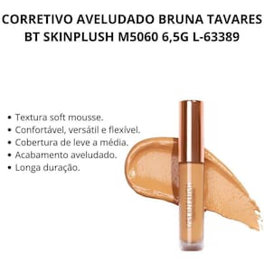 Corretivo Aveludado Bruna Tavares Bt Skinplush M5060 6,5G L-63389 Corretivo Aveludado Bt SkinPlush M5060 Um corretivo de textura soft mousse que oferece uma cobertura de leve a média e acabamento aveludado. Além de corrigir, iluminar e camuflar, o BT Skinplush conta com diversos ativos que ajudam a atenuar a aparência das olheiras e bolsas ao redor dos olhos. Ele também auxilia na hidratação e melhora da elasticidade da pele. Possui uma textura mousse, versátil e aveludada que garante maior conforto ao longo do uso. Ele é resistente à água, suor e oleosidade.Subtom quente amarelado. . Benefícios -textura soft mousse. -confortável, versátil e flexível. -cobertura de leve a média. -acabamento aveludado. -longa duração. -oftalmologicamente testado. -dermatologicamente testado. -não testado em animais. . Modo de Uso Com o auxílio do aplicador, deposite o corretivo nas áreas que deseja disfarçar e corrigir.Em seguida, dê leves batidinhas com a esponja, a ponta dos dedos ou com um pincel, até o produto aderir na pele de maneira natural e sem marcas. Ean: 7896032679245