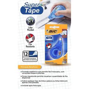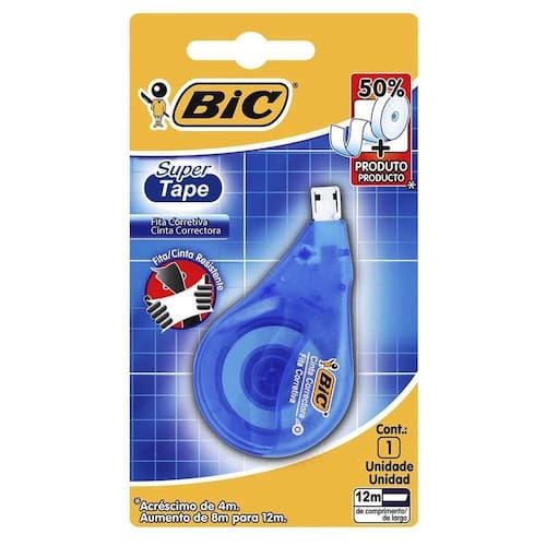 Corretivo Em Fita Escolar Branco Bic Super Tape 12m Corretivo Em Fita Escolar Branco Bic Super Tape 12m Marca BICModelo Fita CorretivaFormato do corretor FitaFormato de venda UnidadeUnidades por kit 1 DetalhesCorpo transparente permite visualizar a quantidade de fita disponívelDesign ergonômicoCobre qualquer tipo de tintaCorreção instantânea. Permite escrita imediata sem esperar para secarCobre uma palavra ou uma linha inteira de uma só vez Produto certificado conforme Portaria Inmetro Nº 333/2012 Segurança, Compulsório, Registro 003222/2012, OCP0040, INMETRO EmbalagemCorretivo Em Fita Escolar Branco Bic Super Tape 12m Garantia3 Anos
