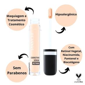 O Corretivo Sérum Retinol é Maquiagem e Tratamento Cosmético em um só produto. Com ativos como Retinol Vegetal, Niacinamida, Pantenol e Biocolágeno, Que ajudam a minimizar a aparência de rugas, linhas de expressão. Disfarça imperfeições, olheiras, sinais de cansaço e uniformiza o tom da pele. Possui cobertura média, com acabamento de efeito natural, rápida absorção e sem craquelar. Para todos os tipos de pele. . Modo de Uso Aplique uma pequena quantidade ao redor dos olhos e nas imperfeições da pele. Espalhe com leves batidinhas até obter o efeito desejado. . Precauções Manter fora do alcance das crianças. Este produto foi formulado de maneira a minimizar possível surgimento de alergia. Em caso de eventual sensibilidade suspender o uso. Uso Externo.