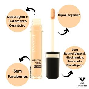 O Corretivo Sérum Retinol é Maquiagem e Tratamento Cosmético em um só produto. Com ativos como Retinol Vegetal, Niacinamida, Pantenol e Biocolágeno, Que ajudam a minimizar a aparência de rugas, linhas de expressão. Disfarça imperfeições, olheiras, sinais de cansaço e uniformiza o tom da pele. Possui cobertura média, com acabamento de efeito natural, rápida absorção e sem craquelar. Para todos os tipos de pele. . Modo de Uso Aplique uma pequena quantidade ao redor dos olhos e nas imperfeições da pele. Espalhe com leves batidinhas até obter o efeito desejado. . Precauções Manter fora do alcance das crianças. Este produto foi formulado de maneira a minimizar possível surgimento de alergia. Em caso de eventual sensiblidade suspender o uso. Uso Externo. Ean: 7896609550151
