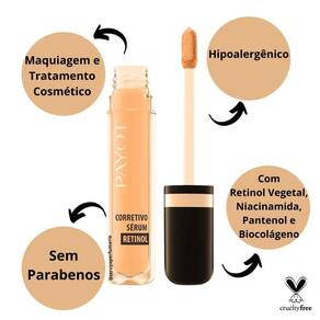 O Corretivo Sérum Retinol é Maquiagem e Tratamento Cosmético em um só produto. Com ativos como Retinol Vegetal, Niacinamida, Pantenol e Biocolágeno, Que ajudam a minimizar a aparência de rugas, linhas de expressão. Disfarça imperfeições, olheiras, sinais de cansaço e uniformiza o tom da pele. Possui cobertura média, com acabamento de efeito natural, rápida absorção e sem craquelar. Para todos os tipos de pele. . Modo de Uso Aplique uma pequena quantidade ao redor dos olhos e nas imperfeições da pele. Espalhe com leves batidinhas até obter o efeito desejado. . Precauções Manter fora do alcance das crianças. Este produto foi formulado de maneira a minimizar possível surgimento de alergia. Em caso de eventual sensiblidade suspender o uso. Uso Externo.