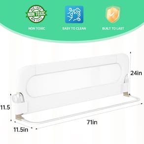 Tamanho do trilho da cama: 188 cm de comprimento x 60 cm superior - Tamanho do trilho da cama: 188 cm de comprimento x 60 cm superior - Segurança em primeiro lugar: nossos trilhos de cama apresentam um design de base em forma de U que aumenta a superfície de contato da cama e está equipado com âncora reforçada, garantindo 100% de segurança para o seu pequeno. Não escorrega ou desliza como outros trilhos de berço. - Proteção contra colisão: fizemos esponjas embutidas onde quer que o trilho de proteção possa tocar para evitar que seu filho se machuque por colisão - Trava de segurança: design dobrável, conveniente para as crianças subirem e saírem da cama ao mesmo tempo, e os lados esquerdo e direito dos trilhos da cama são projetados com um sistema de trava de segurança dupla para evitar o risco de as crianças tocarem por engano - Instalação simples: nosso trilho de proteção de cama pode ser instalado em menos de 10 minutos e pode ser montado sem ferramentas - Capa de tecido de alta qualidade: feita de tecido oxford 300D, que pode ser desmontado e limpo