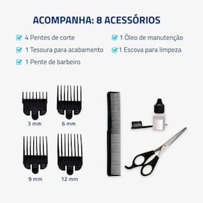 Além dos pentes, o CR-07 acompanha tesoura, pente de barbeiro, escova de limpeza e óleo lubrificante.