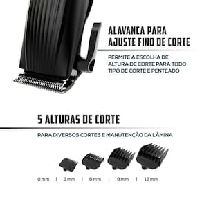 Conta com incríveis 9 acessórios e 4 opções de pentes para corte que se ajustam em até 4 alturas de corte, sendo (3, 6, 9 e 12mm). Também acompanha tesoura, capa protetora de lâminas, óleo lubrificante e escova para limpeza, tudo para garantir o perfeito funcionamento.