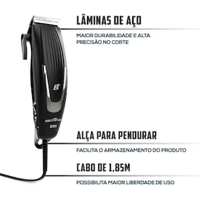 • 18W de potência • 4 pentes de corte com 3, 6, 9 e 12mm • Pente, óleo para lubrificação e escova para limpeza • Lâminas em aço • Alça para pendurar • Botão liga/desliga • Alavanca para ajuste fino de altura • Material: Plástico e aço.