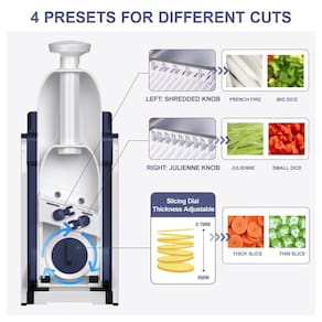 - FÁCIL DE USAR: Primeiro, coloque os alimentos na calha e depois simplesmente empurre a alça para obter rapidamente a forma desejada - fatias, tiras, juliana ou cubos. A espessura da fatia pode ser ajustável de 0,1 a 8 mm, ótima para batatas, cenouras, tomates, pepinos e muito mais.