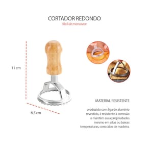 Contem: 1 Cortador Redondo Medidas: 11 x 6,5 cm Material: Aluminio e Madeira