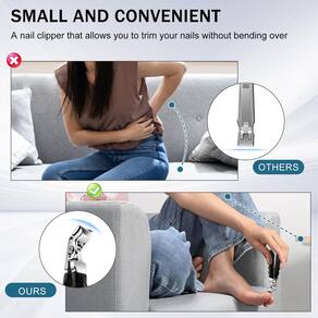 - [Design ergonômico] Esses cortadores de unhas para idosos têm um ângulo exclusivo para facilitar o uso, especialmente para as unhas dos pés, e incluem um coletor de unhas embutido para evitar que os recortes se espalhem. Esse design é ideal para reduzir a necessidade de se curvar desconfortavelmente, tornando-o a melhor escolha para mulheres, idosos e pessoas com dores nas costas
