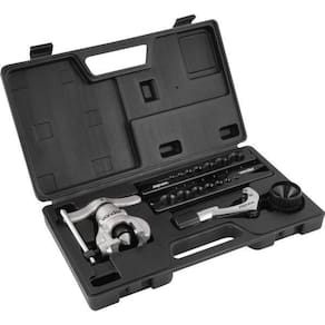 Conteúdo da Embalagem:1 Jogo de cortador e flangeador de tubos com 6 peças, sendo: 1 maleta plástica, 1 flangeador, 2 bases de fixação dos tubos, 1 cortador de tubos e 1 rebarbador Descrição:Cortador e flangeador de tubos, jogo com 6 peças, VONDERAplicações e dicas de uso:Indicado para cortar e flangear tubos de cobre e alumínioDestaques e diferenciais:Possui escareador para a remoção de possíveis rebarbas ou irregularidadesCaracterísticas Técnicas:Capacidade do cortador para tubos de cobre: 1/8 a 1.1/8 - 3 mm a 28 mm Capacidade do flangeador base de fixação para tubos de cobre: 1 Flangeador base com as medidas em polegadas: 3/16, 1/4, 5/16, 3/8, 1/2, 5/8, 3/4 + 1 flangeador base com as medidas em milímetros: 5 mm, 6 mm, 8 mm, 10 mm, 12 mm, 16 mm, 19 mm Material do corpo do cortador de tubos de cobre: Alumínio Material do flangeador para tubos: Ferro fundido nodularGarantia legal: 90 dias Ean: 7893946539733