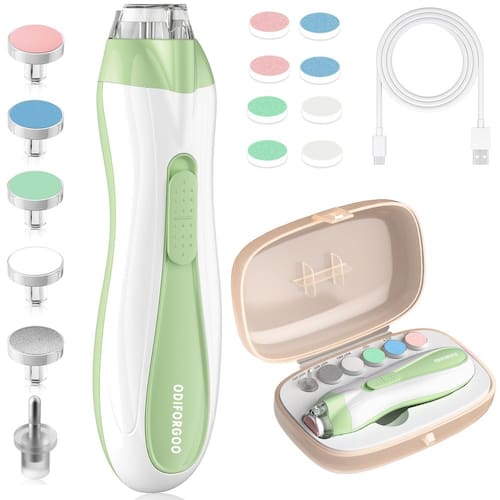 Usa um material especial de cabeça de moagem arredondada, que é macio e não tem bordas afiadas. Se você usar muita força ao moer, o motor parará de funcionar, evitando efetivamente arranhar a pele delicada do bebê. A velocidade da cabeça de moagem foi cuidadosamente ajustada para mantê-la dentro de um intervalo seguro e suave, garantindo que, mesmo que toque a pele ao redor das unhas do bebê, não causará nenhum dano, fornecendo proteção de segurança completa para o cuidado das unhas do bebê. - Design de segurança: a ODIFORGOO usa um material especial de cabeça de moagem arredondada, que é macio e não tem bordas afiadas. Se você usar muita força ao moer, o motor parará de funcionar, evitando efetivamente arranhar a pele delicada do bebê. A velocidade da cabeça de moagem foi cuidadosamente ajustada para mantê-la dentro de um intervalo seguro e suave, garantindo que, mesmo que toque a pele ao redor das unhas do bebê, não causará nenhum dano, fornecendo proteção de segurança completa para o cuidado das unhas do bebê. - Operação de baixo ruído: considerando que os bebês são mais sensíveis ao som, este aparador elétrico de unhas usa tecnologia silenciosa. Durante a operação, o ruído gerado é extremamente baixo e não perturba o bebê que está descansando, permitindo que os pais concluam o trabalho de cuidados com as unhas suavemente em um estado silencioso e confortável para o bebê, reduzindo a resistência do bebê aos cuidados com as unhas. Este aparador de unhas para bebês está equipado com uma luz LED suave, para que os dedinhos do bebê possam ser vistos claramente mesmo em condições de pouca luz. - Acabamento preciso: equipado com cabeças de moagem finas e sistemas de energia avançados, pode moer com precisão as bordas e superfícies das unhas do bebê. Quer sejam as unhas finas de recém-nascidos ou as unhas de bebês mais velhos que estão começando a crescer e endurecer, pode ser facilmente aparada no comprimento e forma apropriados, garantindo um efeito de corte uniforme e suave, evitando unhas irregulares ou aparando demais. - Operação recarregável e conveniente: este cortador de unhas para bebês tem um design de carregamento USB atualizado, garantindo carregamento rápido e fácil e é mais leve do que os tipos de bateria. O design do botão de ajuste de velocidade contínuo permite que você ajuste facilmente a velocidade conforme necessário. Além disso, seu corpo pequeno e leve é fácil de transportar, seja em casa, viajando ou em um local de cuidados com o bebê, sempre atende às necessidades de cuidados com as unhas do seu bebê. - HIGIÊNICO E FÁCIL DE LIMPAR: Este cortador de unhas para bebês tem função atualizada à prova de poeira. Durante o uso, o pó das unhas é efetivamente coletado. A superfície do corpo é feita de material liso, que não é fácil de ser manchado com sujeira. Basta limpar suavemente com um pano úmido para mantê-lo limpo e arrumado, fornecendo proteção higiênica para a saúde do bebê, garantindo que o aparador de unhas esteja limpo e higiênico sempre que for utilizado.