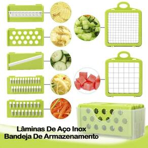 Cortador Multi Fatiador De Verduras E Alimentos Cinza 7 Em 1 O cortador Multi Fatiador De Verduras E Alimentos Cinza 7 Em 1 é ideal para facilitar a execução de suas receitas com rapidez e segurança. Com suas 8 lâminas, ele é capaz de picar, ralar e cortar os mais diversos alimentos, como cebolas, tomates, pepinos, queijos e etc, fazendo com que os alimentos sejam aproveitados ao máximo. Seu material é aço inoxidável, além disso o cortador também conta com lâminas super afiadas, basta pressionar a tampa para baixo e os alimentos serão cortados facilmente