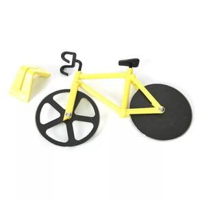 Cortador de pizza em formato de bicicleta. Rodas em aço inox com corte afiado. Acompanha apoio para deixar a bicicleta em pé.